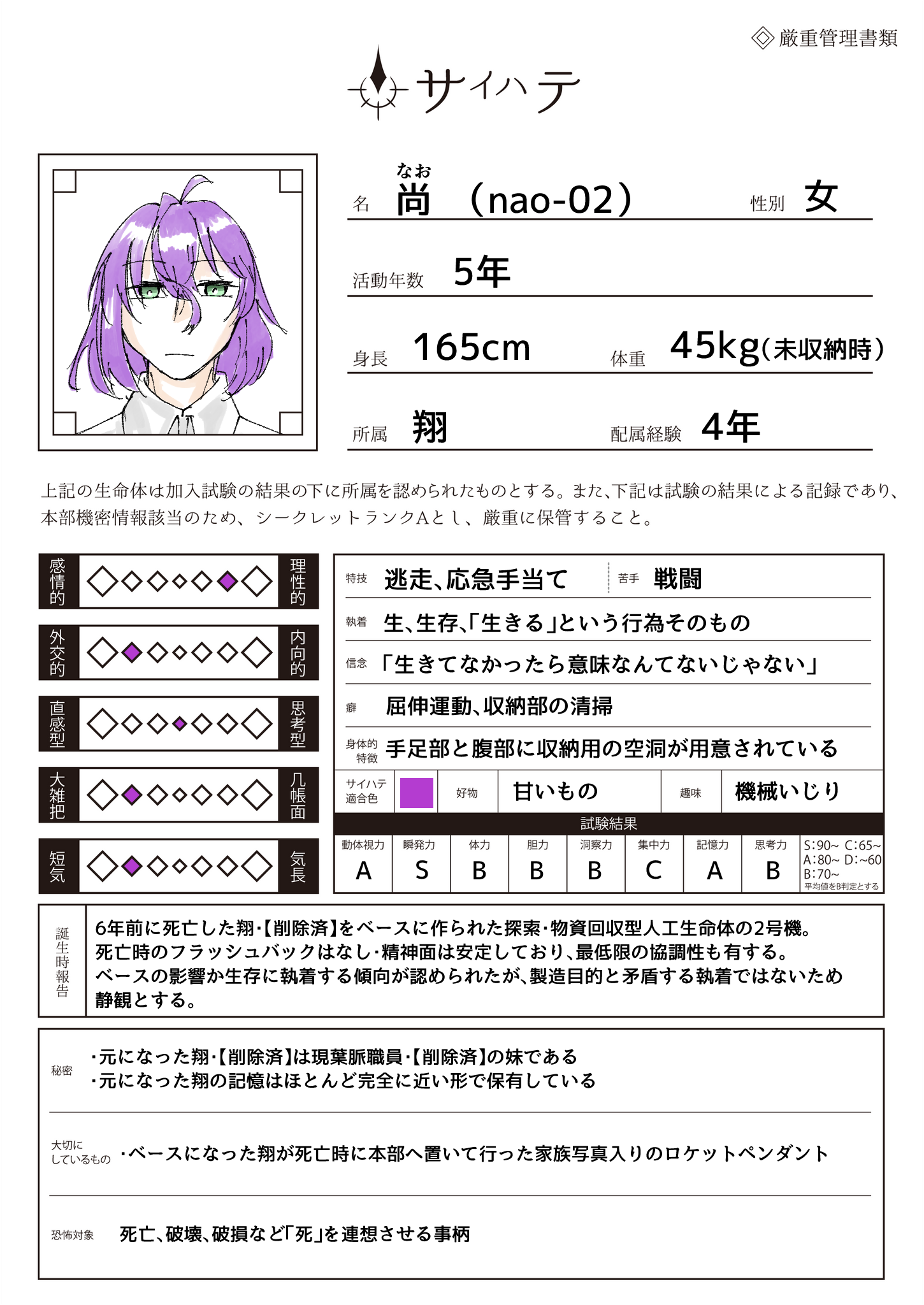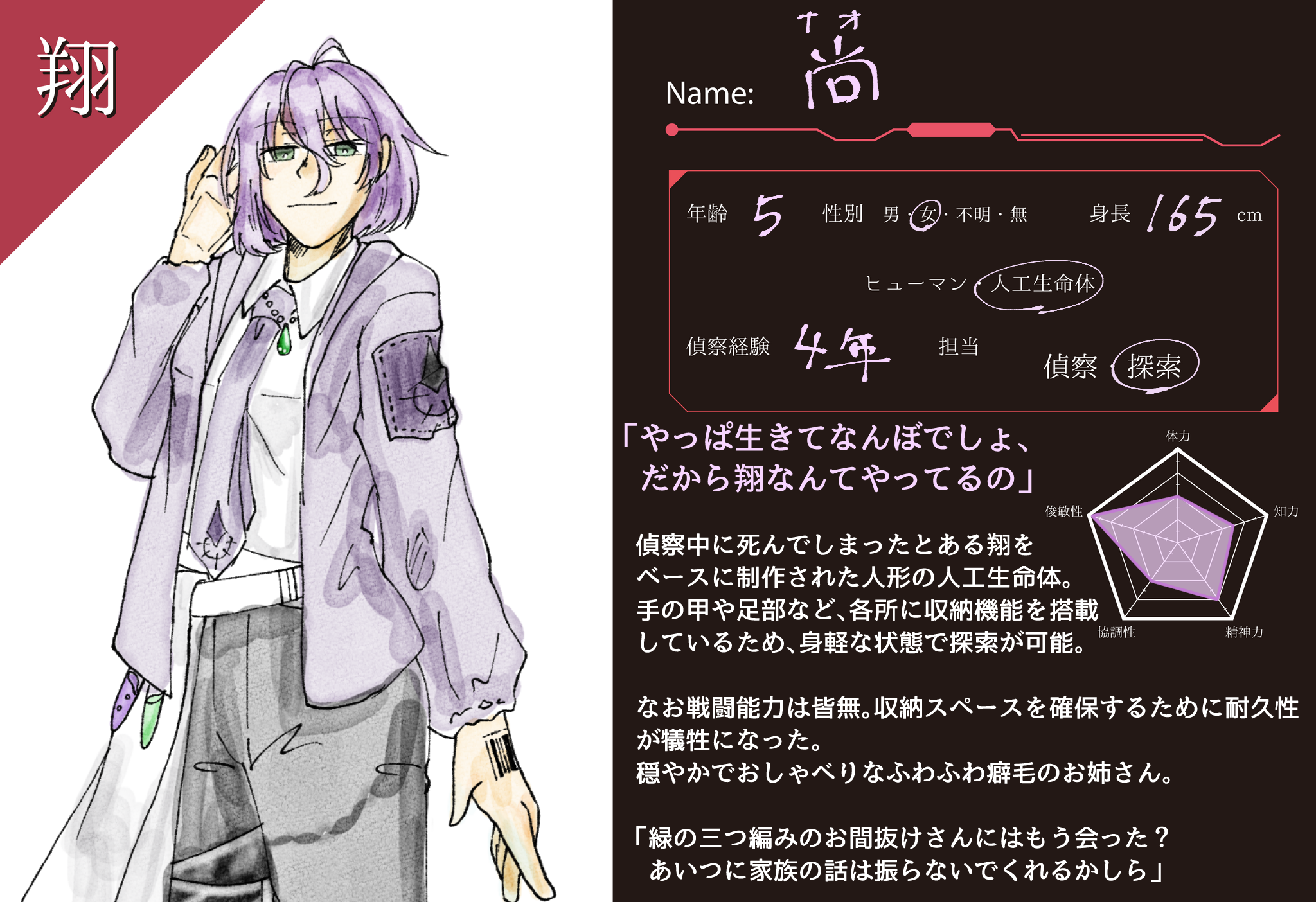 とある葉脈の実妹が死亡した際、その実の両親によって1号機が制作されるも、完成・稼働開始と同時に全損、現在の尚が制作される。その後は1年間の訓練を経て正式に翔として活動中。