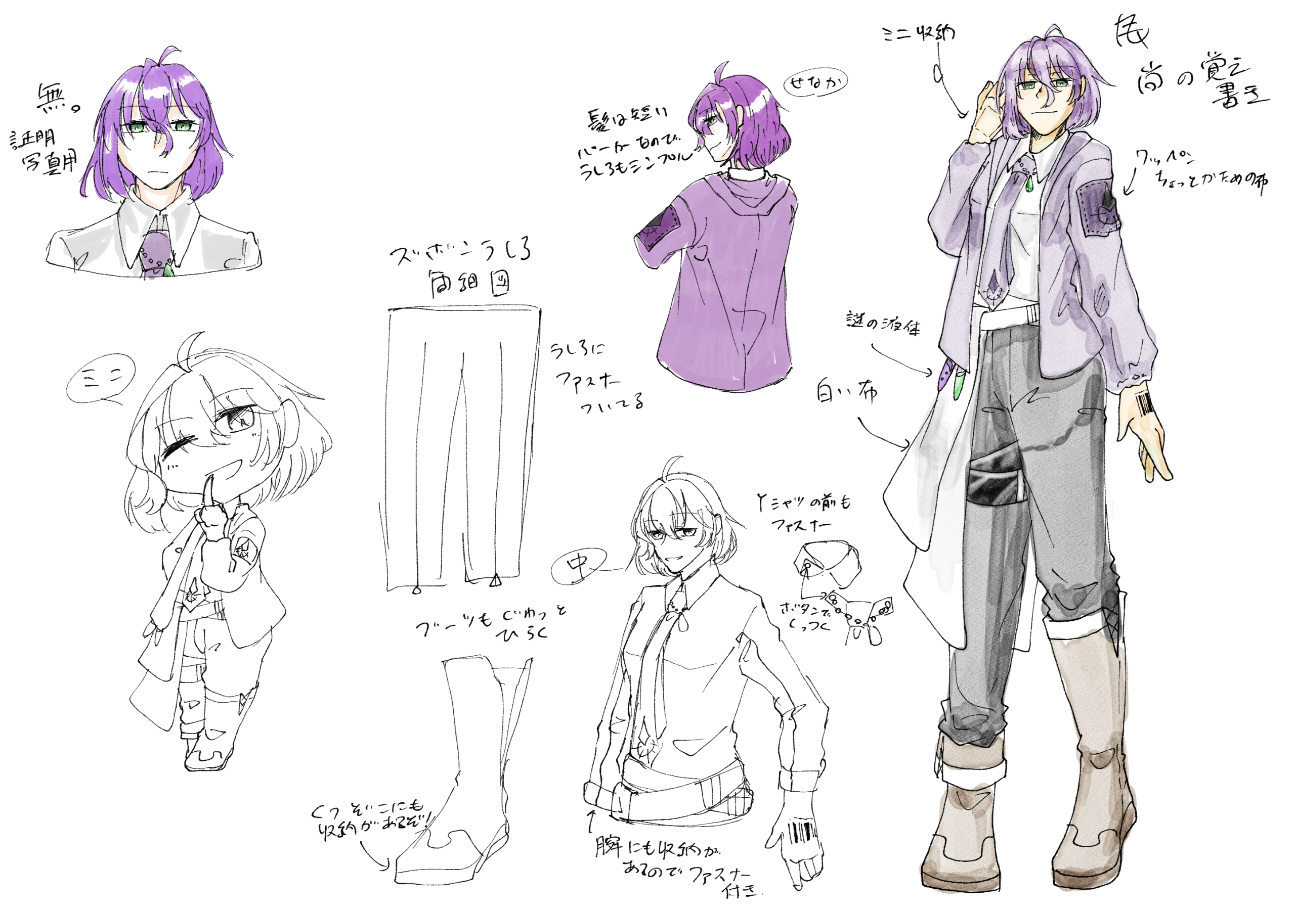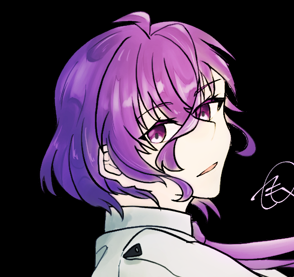 どこか飄々とした雰囲気を漂わせる、穏やかでおしゃべりが好きな女性。短いのと長い2本のアホ毛と紫のふわふわした髪、緑の目。いつもYシャツに薄紫色のパーカーを着ている。