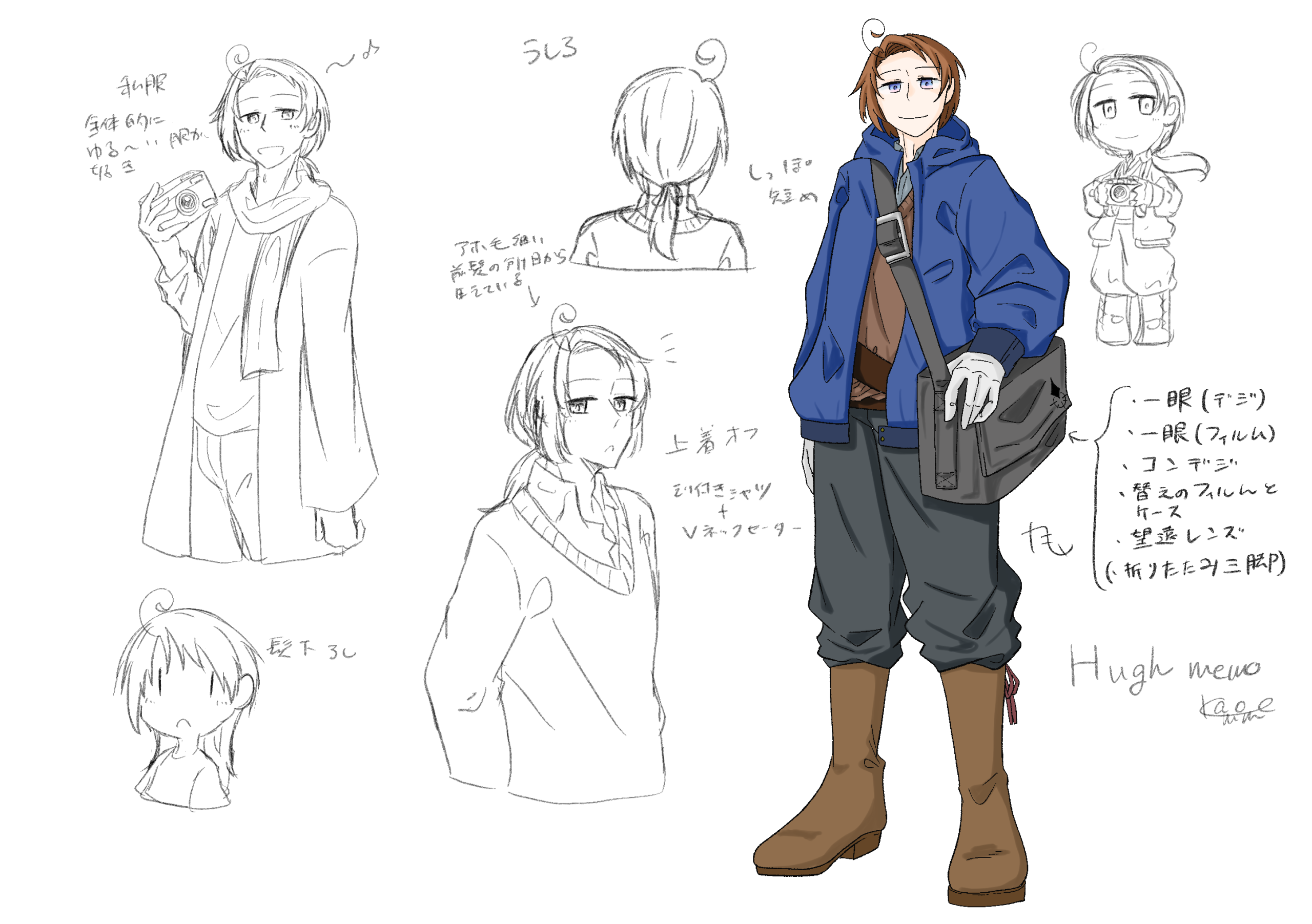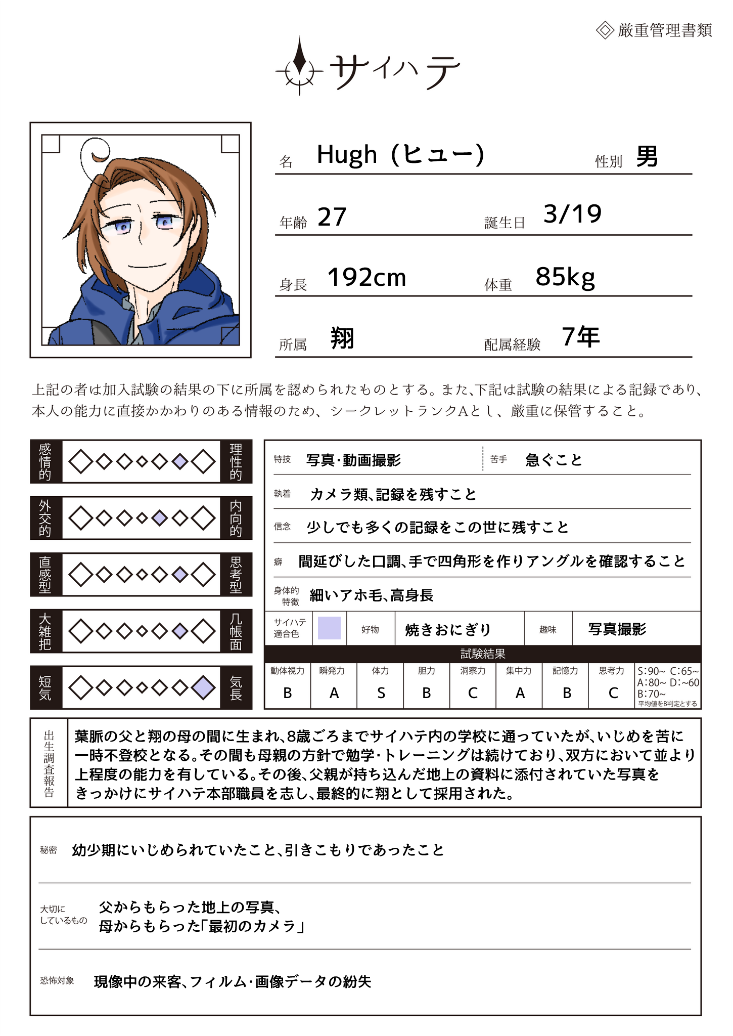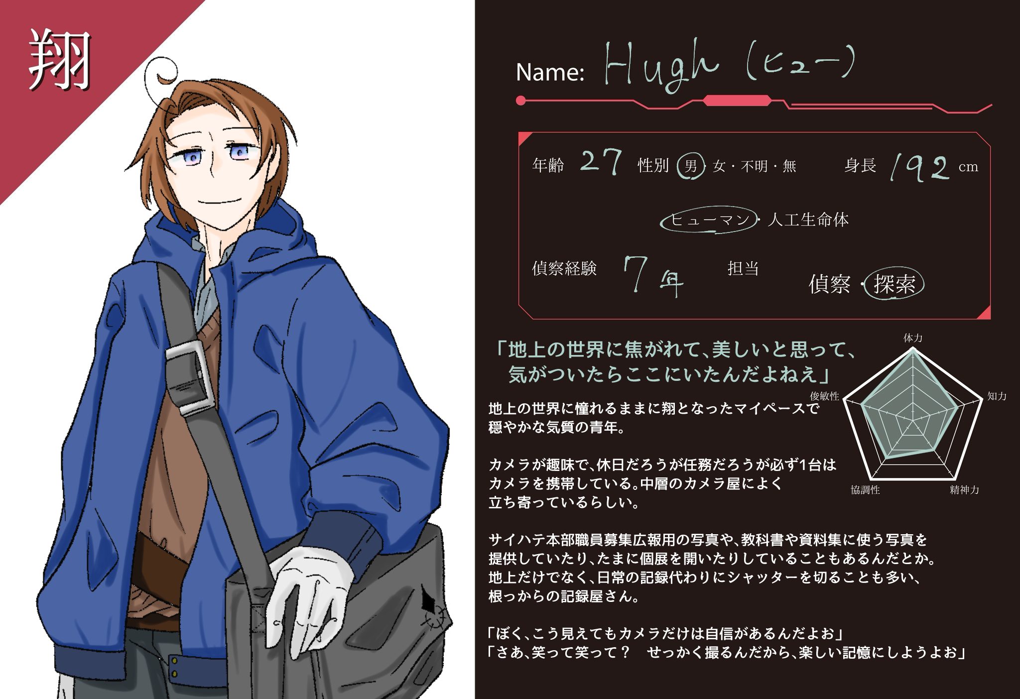 写真撮影が何より大好きな、穏やかでマイペースな翔の青年。細いアホ毛がトレードマークで、少し伸びた髪を一つまとめにしている。性格とぱっと見た時の印象の割に背が高い男。素の身体スペックがそれなりに高く、特に持久力と集中力に優れる。小さなころからカメラが好きで、今現在は写真を撮ることをそのまま仕事に持ち込めるくらいには技量も磨いたそう。