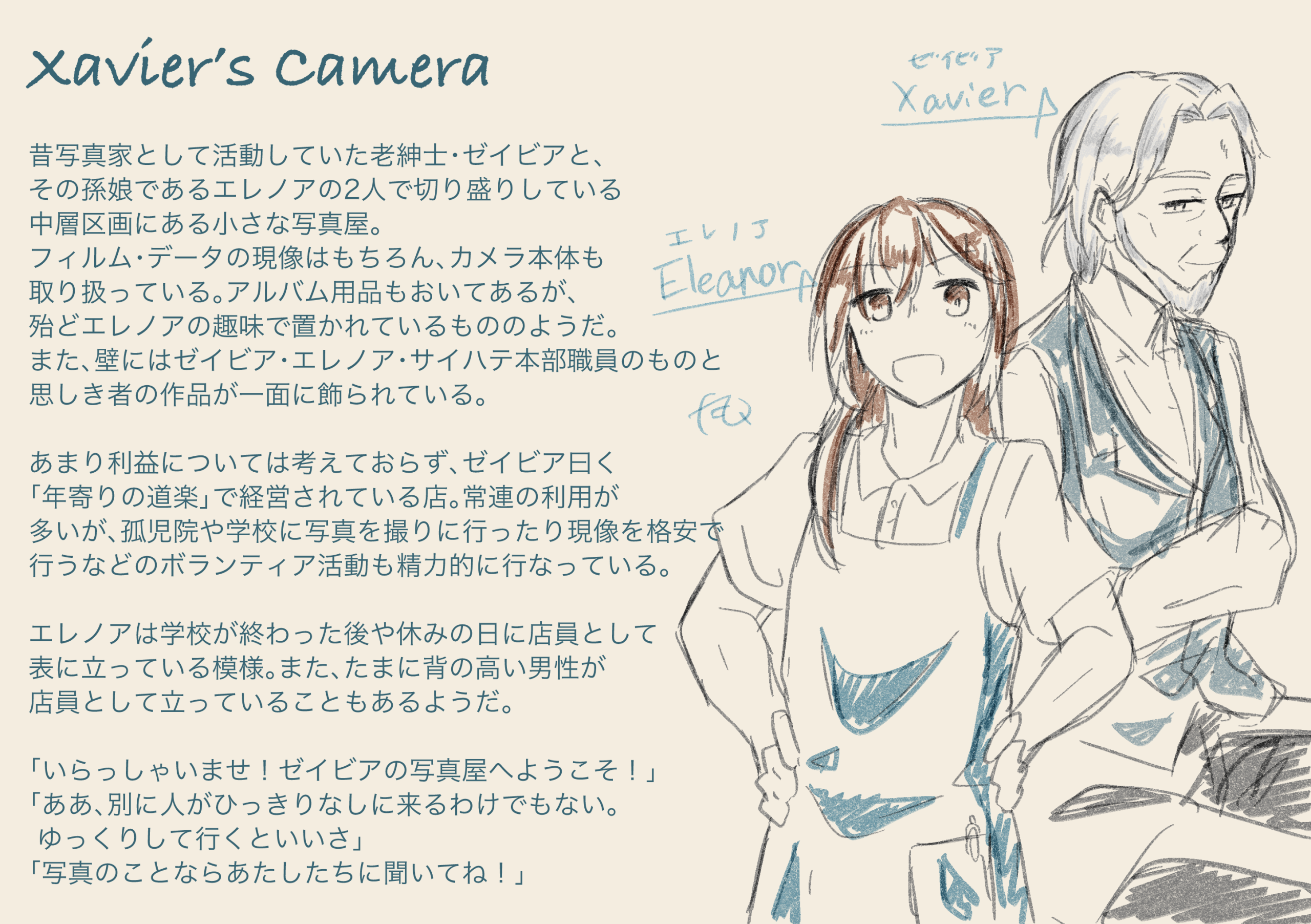 ヒューの父と店主が知人のため、よく世話になっているカメラ屋。現像からカメラ機体の販売まで行っており、老紳士の店主とその孫娘が切り盛りしている、小さな写真屋さん。ヒューは現像室を使わせてもらう代わりに、時折店の手伝いをしているらしい。