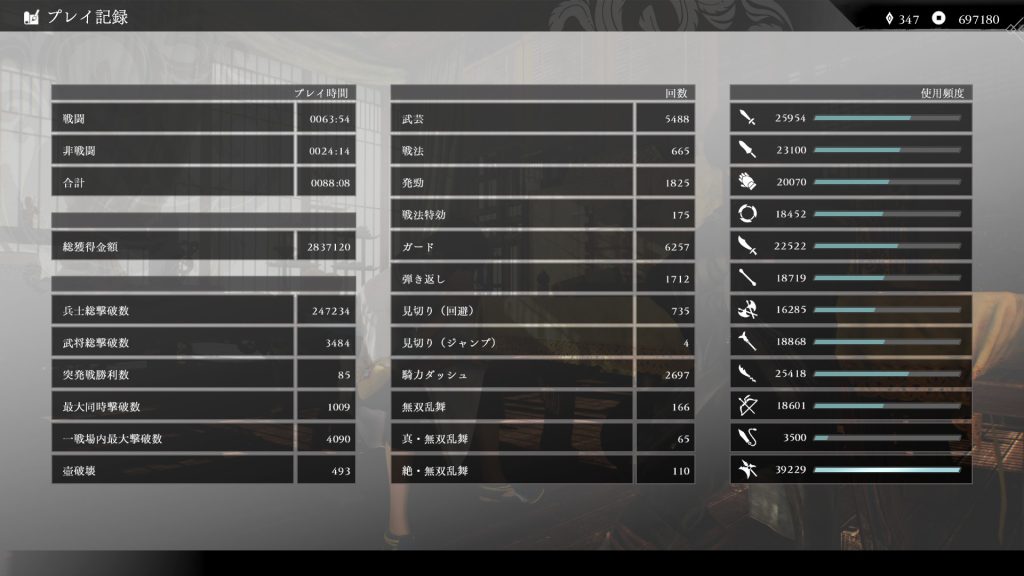 方天戟がずば抜けているのはきっとみんなそうだと思うので置いておくとして、思ってたよりも弓を使い込んでてびっくりしました。でも弓楽しい。