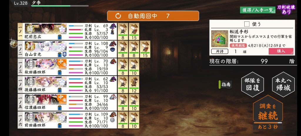 今回は厚と前田は極開花済みなので、いったん白山極の様子を見つつ後藤・信濃・前田・秋田+丙子椒林剣で回ってみようかなぁと。