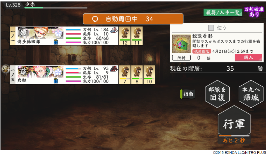 自動周回を止めない目的だと、部隊で一番最後に動くようにしなければならないのでちょっと面倒。あと刀装は神技発動時にしか回復できないので、刀装損害が激しいところで運用しようとすると難しいところ。全裸+白山極はアリかな~とも思いますが、遠戦で同時に2振り重症になると神技が間に合わなくなる自体が想定されるので難しそうです。う~ん難しい。