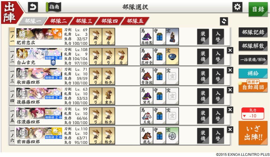 これで今のところ疲労はなし。肥前・後藤・前田が全回復してますがコイツは神技によるものです。元々白山以外中傷だったので……本当に全回復してる……
