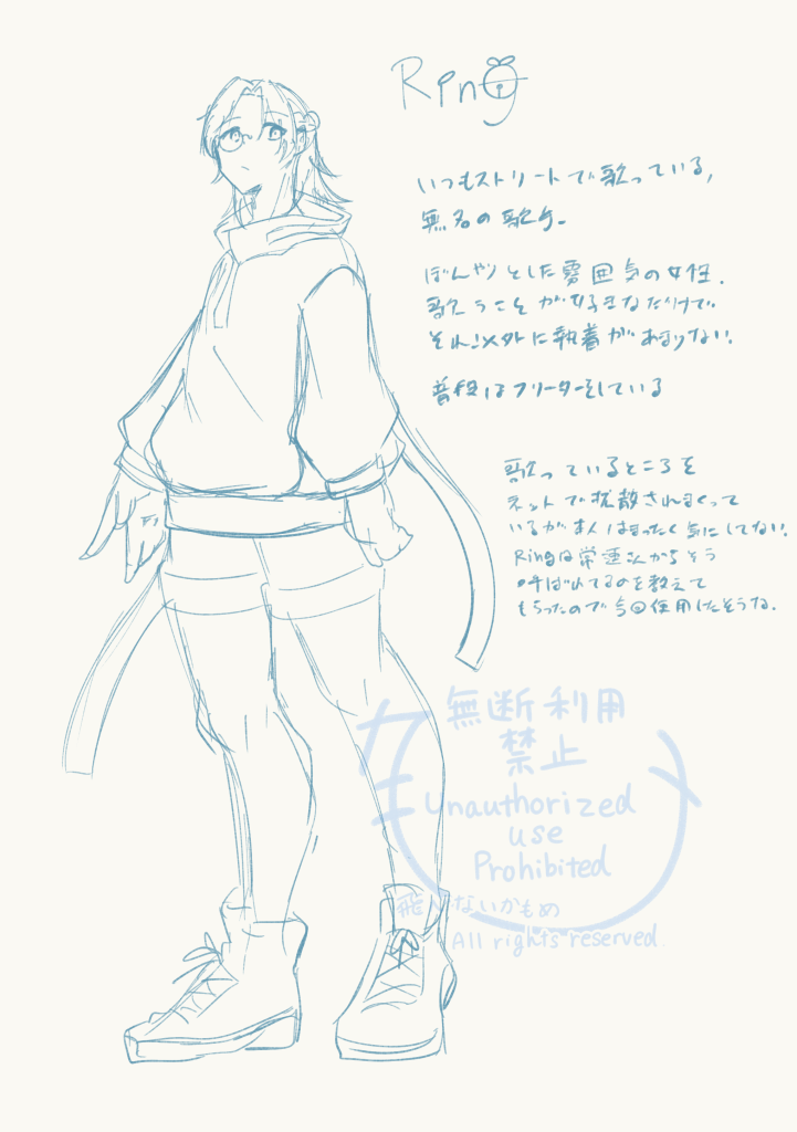 才能をすべて音楽に持って行かれたタイプの女。歌うことが好きで、それ以外の執着がほとんど無い。当然SNS等もやっておらず、通りすがりにRingの歌を聴いて脳を焼かれた常連のファンが今回のフェスのことを教えて参加するに至ることになった。